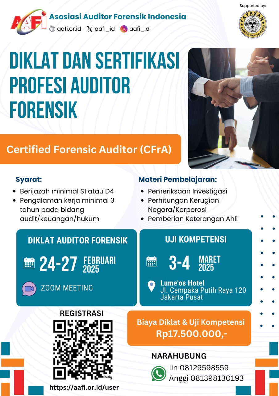 Asosiasi Auditor Forensik Indonesia Papani (AAFI PAPANI), dengan dukungan dari Yayasan Cakra Bhakti Santosha, kembali mengadakan Diklat dan Sertifikasi Profesi Auditor Forensik dengan gelar Certified Forensic Auditor (CFrA). Program ini bertujuan untuk meningkatkan kompetensi para auditor dalam bidang audit investigatif dan forensik guna mendukung upaya pemberantasan tindak pidana keuangan dan korupsi.
